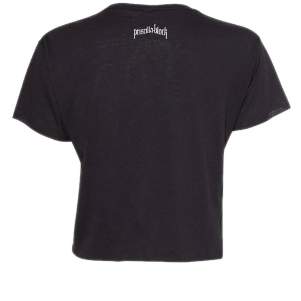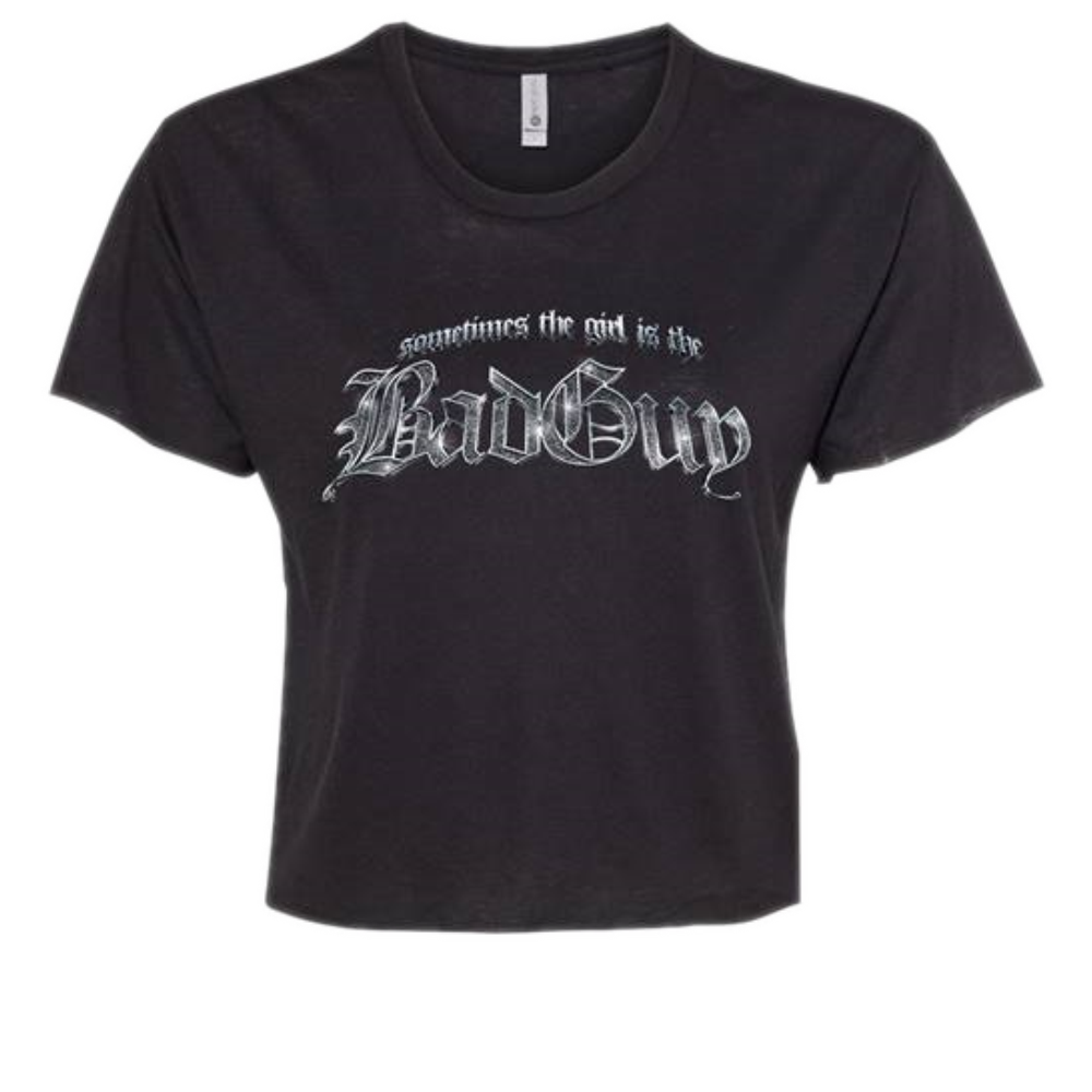 Ladies black crop tee with Sometimes the girl is the BAD GUY design on the front and logo on the on the back.