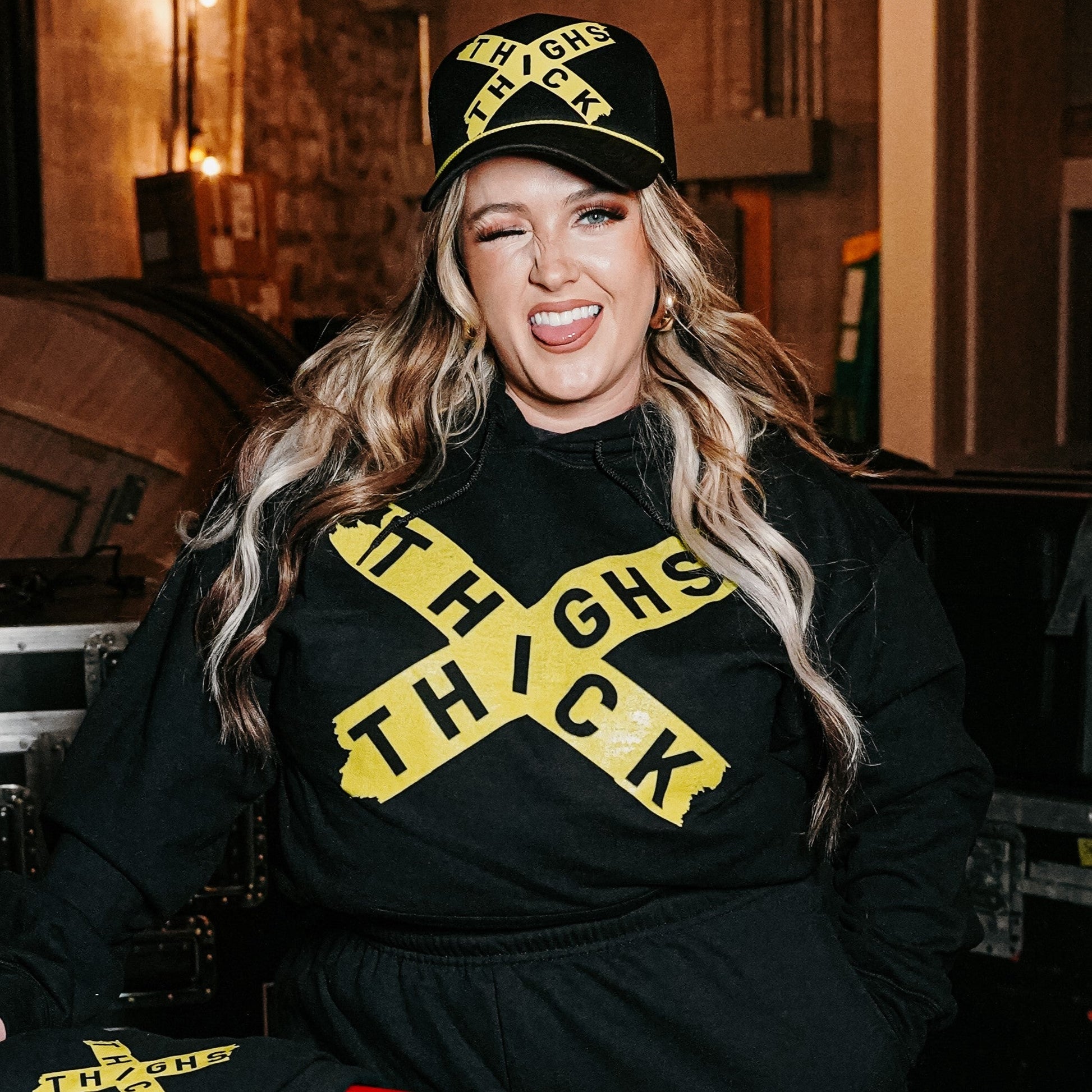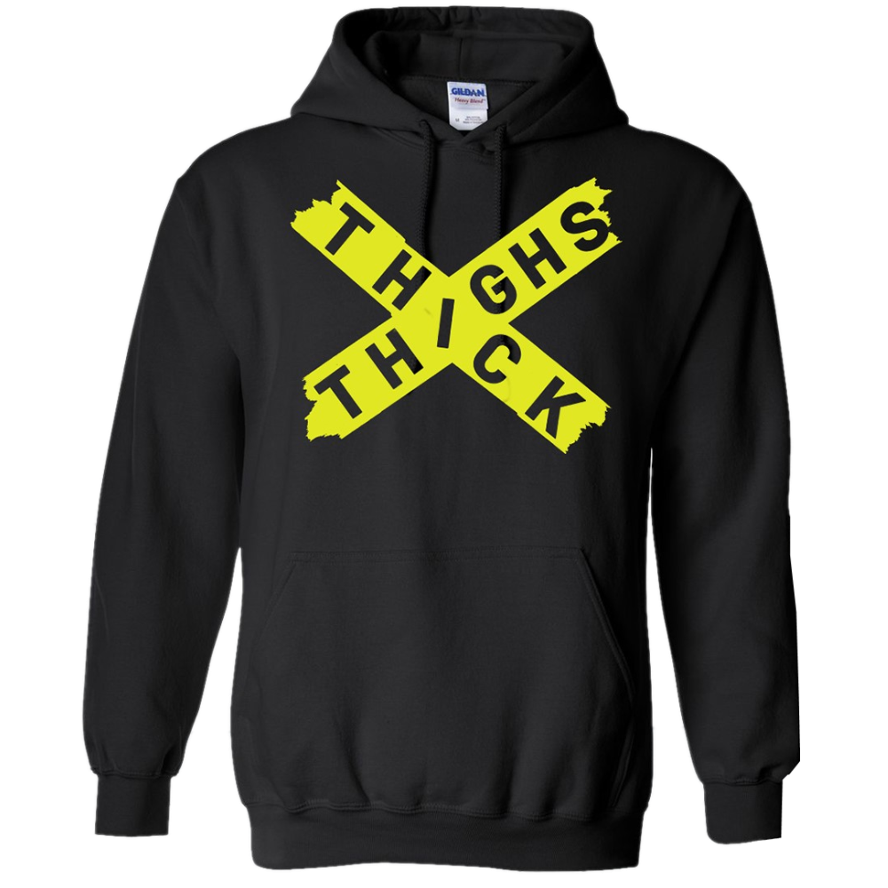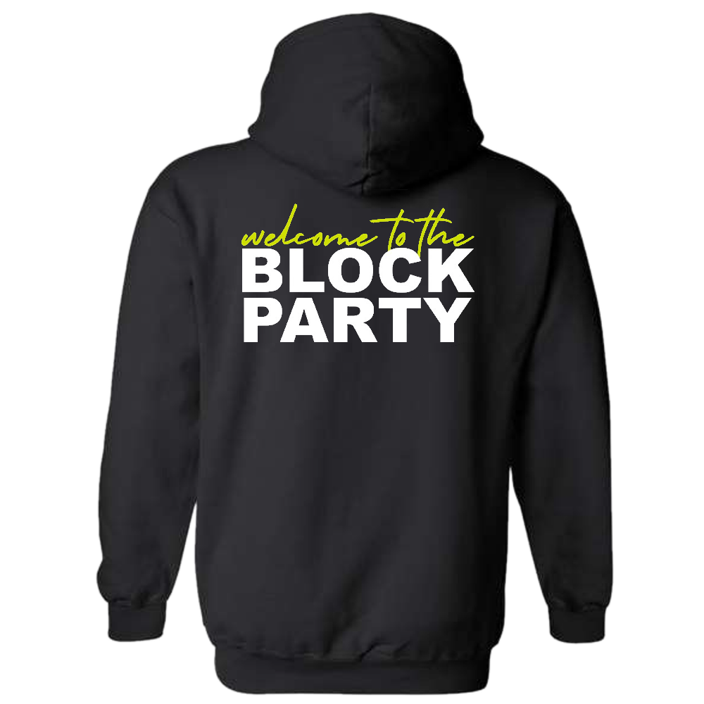 Unisex black pullover hoodie. Thick Thighs caution tape design on the front and Welcome To The Block Party on the back.