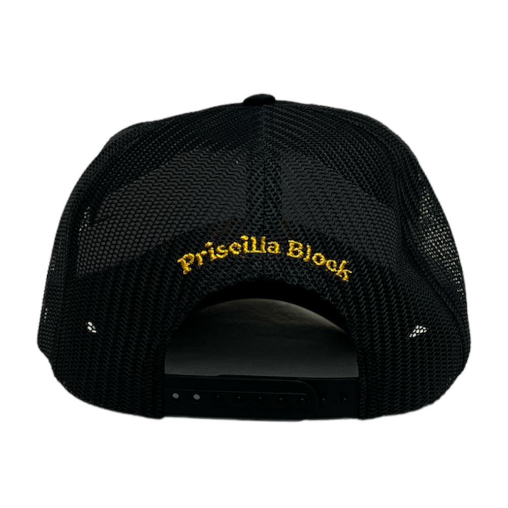 Sass N' Ass embroidered on this retro "scrambled eggs" trucker hat. Priscilla Block embroidered on the back.