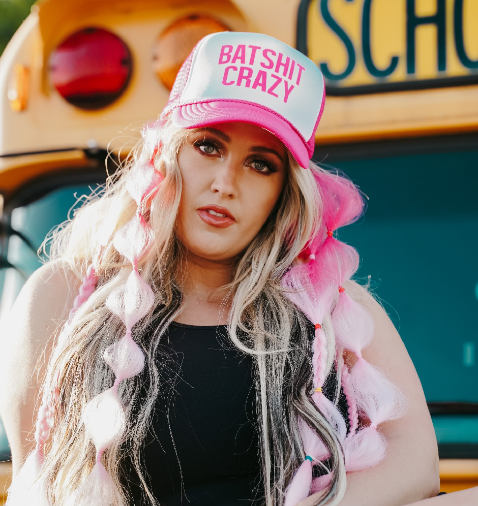Batshit Crazy hot pink trucker hat. Priscilla Block embroidered on the back.